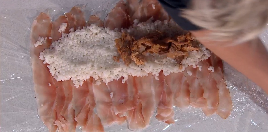 Su un foglio di pellicola, disponiamo le fettine di speck, sovrapponendole leggermente. Una volta creato un rettangolo, Distribuiamo sopra il riso condito, schiacciando col cucchiaio. Al centro, mettiamo le costine sfilacciate. Arrotoliamo speck e riso sulle costine, usando la pellicola. Stringiamo per bene, chiudendo la pellicola a caramella. Lasciamo riposare in frigorifero.