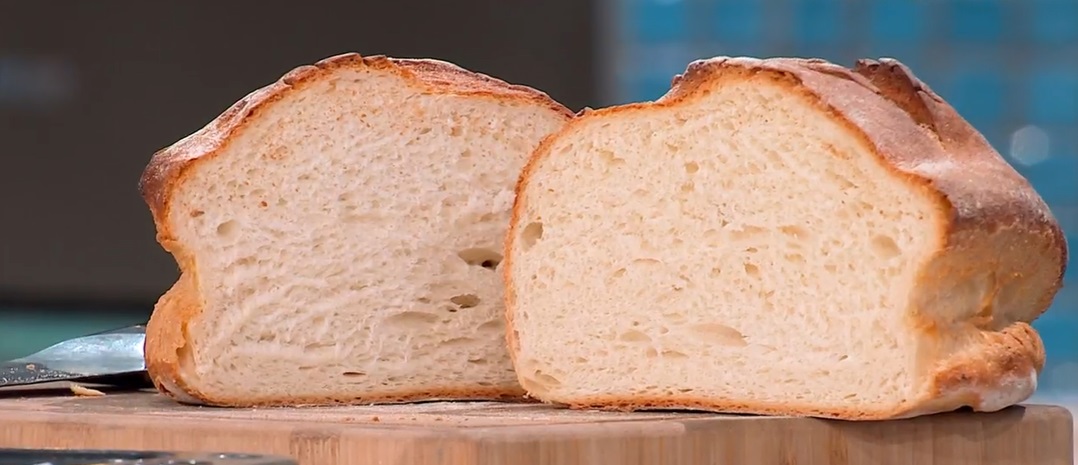 Prendiamo un filone e, con il mattarello, stendiamo solo metà dell’impasto, formando una sorta di lingua. Arrotoliamo la metà stesa sull’altra (non stesa), quindi posizioniamo il filone sulla teglia con carta forno, rivolgendo la piega verso l’alto. Copriamo e lasciamo lievitare 1 ora e mezza.