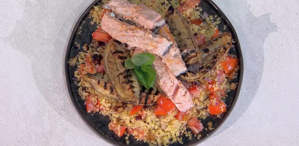 In una ciotola capiente, quindi, mettiamo il bulgur, le melanzane rosolate, il pomodoro e mescoliamo. Serviamo con sopra le melanzane ed il salmone grigliati.