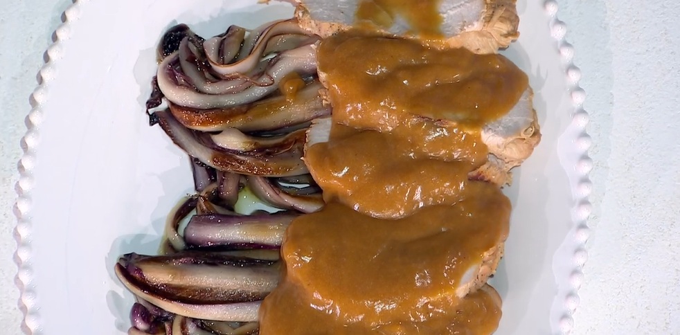 Per accompagnare, tagliamo i cespi di radicchio tardivo a spicchi e li mettiamo a rosolare su una padella ben calda con un filo d’olio ed il coperchio.