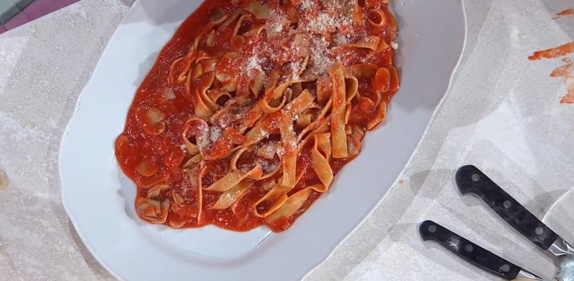 Stendiamo l’impasto ‘riposato’ e ritagliamo le tagliatelle. Le cuociamo in acqua bollente e salata per il tempo necessario. Le scoliamo e le saltiamo in padella con il condimento. Serviamo con una spolverata di formaggio grattugiato.