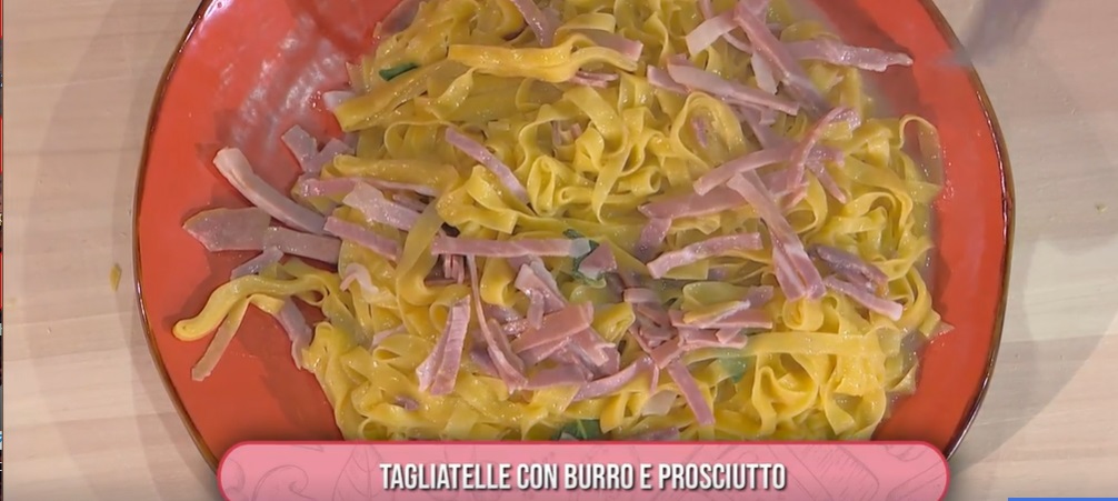 tagliatelle con burro e prosciutto di Alessandra SpisniTorna a fare visita agli amici del mezzogiorno l’amatissima Alessandra Spisni. La cuoca emiliana, colonna dell’indimenticata ‘La prova del cuoco’, arriva in cucina per preparare un classico della tradizione emiliana, le tagliatelle con burro e prosciutto.