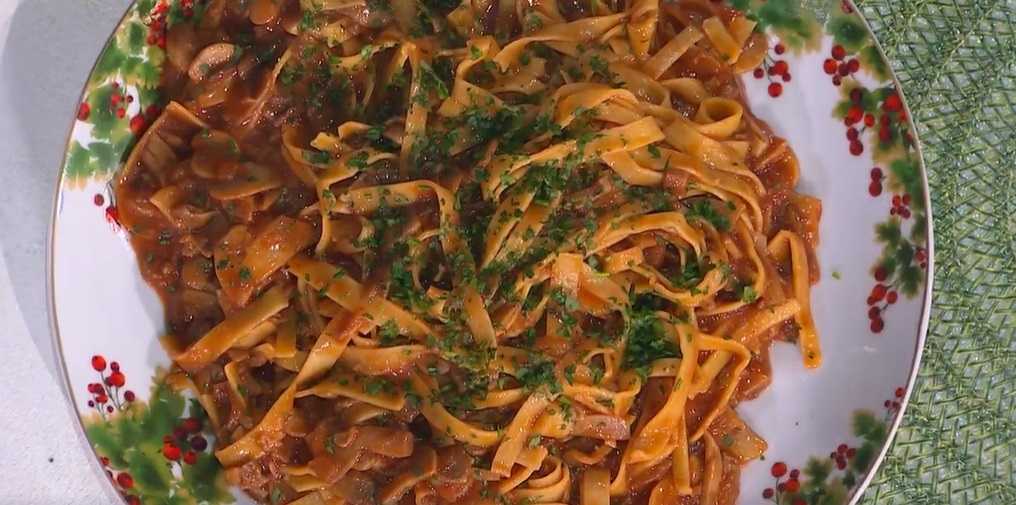 Scoliamo i tagliolini e li saltiamo con il sugo, una noce di burro e del prezzemolo tritato.