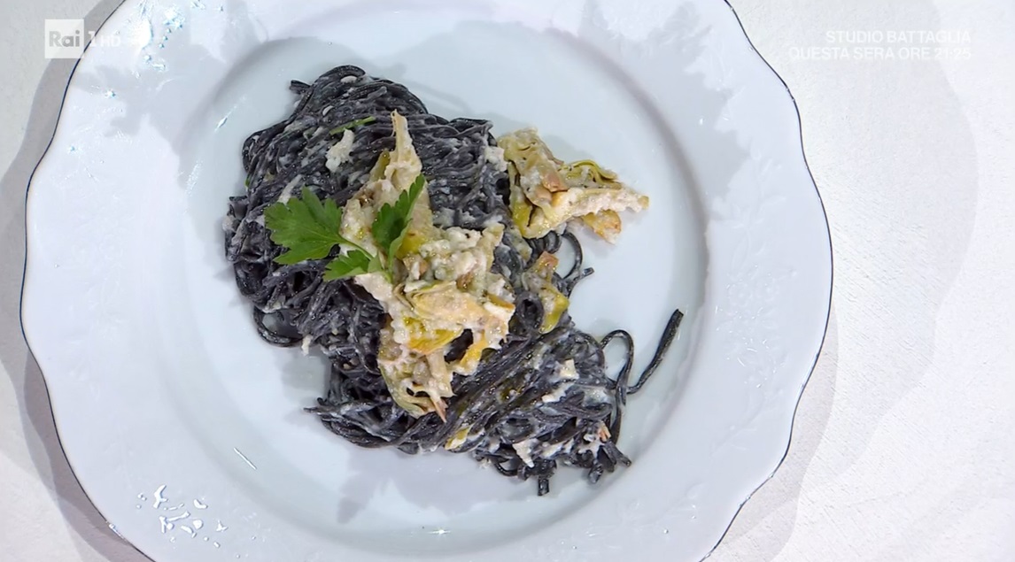 Per i tagliolini, impastiamo la farina e la semola con le uova, il nero di seppia e un pizzico di sale. Facciamo riposare il panetto ottenuto coperto con la pellicola trasparente per almeno 30 minuti. Tiriamo la sfoglia, ne ritagliamo i tagliolini che lessiamo in acqua bollente e salata.