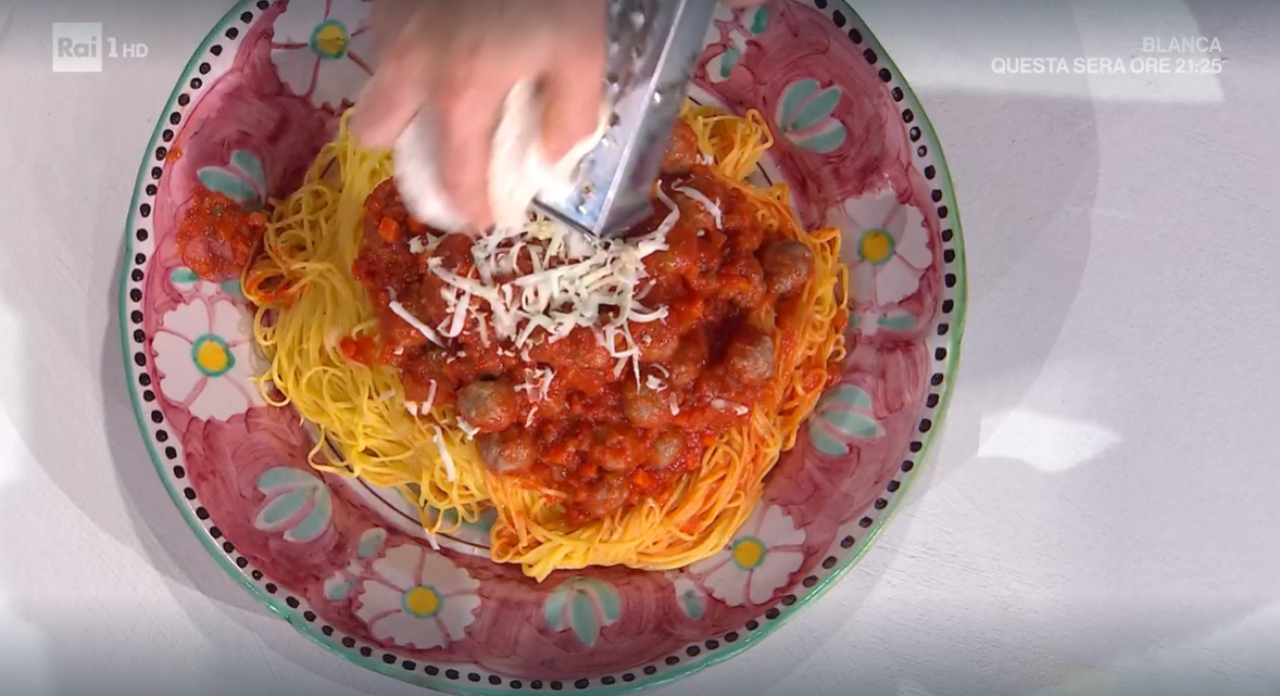 Lessiamo i tagliolini in acqua bollente e salata per un paio di minuti. Li scoliamo e li condiamo con il sugo e le polpette.