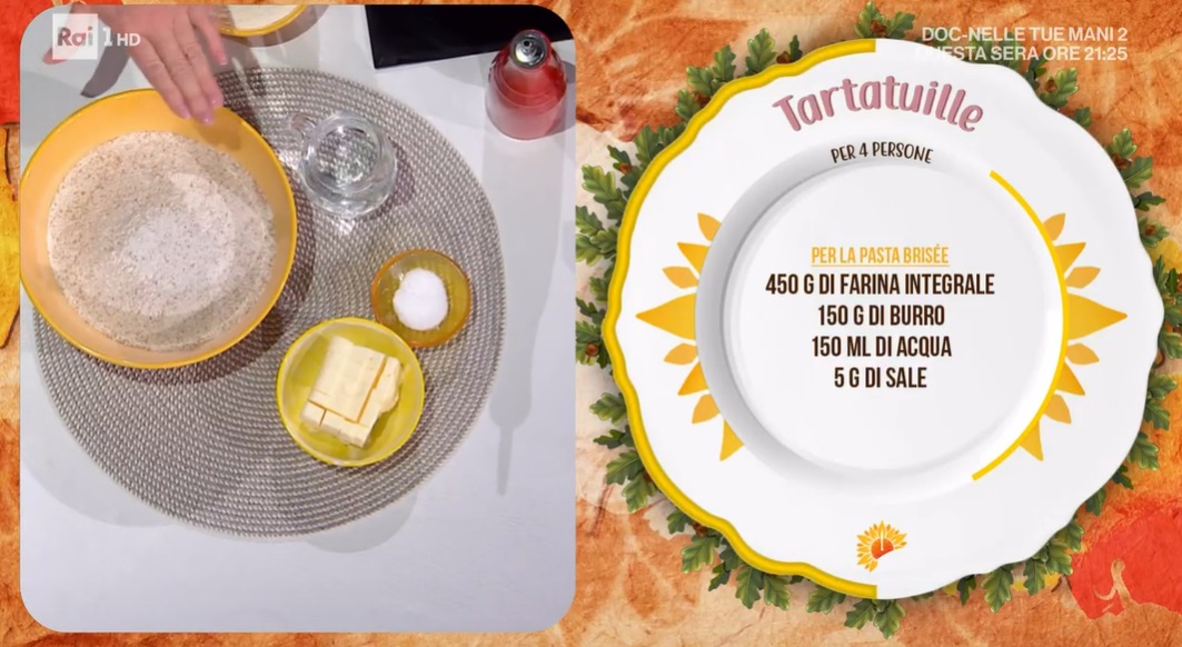 - 450 g farina integrale, 150 g burro, 150 ml acqua, 5 g sale