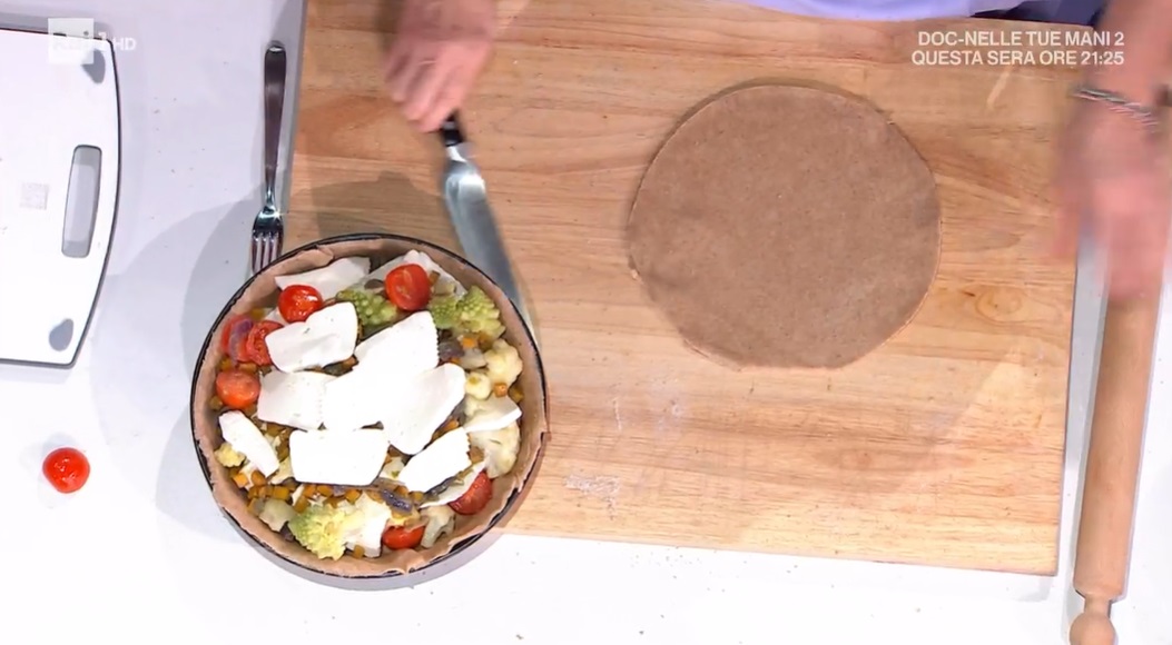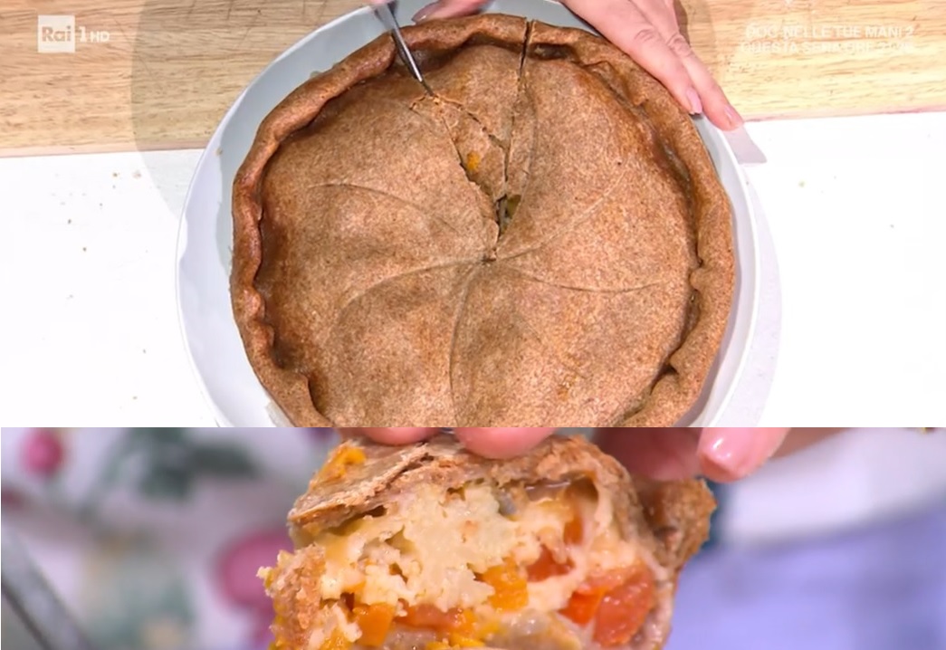 Chiudiamo con l’altro disco di brisèe, sigilliamo bene i bordi. Facciamo un buchetto al centro per fare uscire il vapore. Informiamo a 180º per 30 minuti.