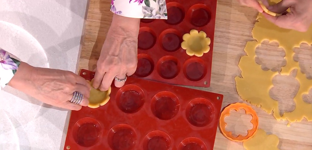 Stendiamo la frolla con il mattarello, ad uno spessore di 3-4 mm. Con un coppapasta a fiore, ritagliamo dei dischetti, che inseriamo negli stampi per muffin. Bucherelliamo il fondo con una forchetta, copriamo ciascuna tartelletta con un dischetto di carta forno e, sopra, del sale grosso o legumi. Cuociamo in forno caldo e statico a 160° per 15 minuti.