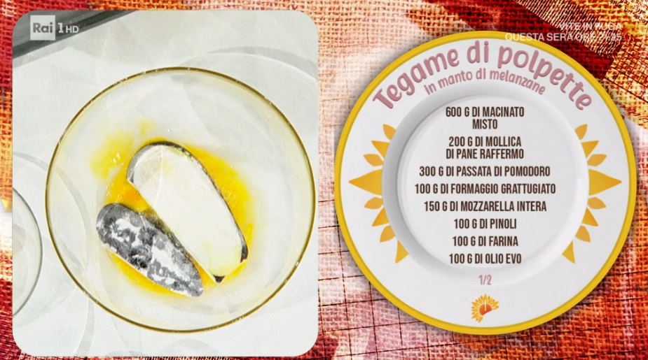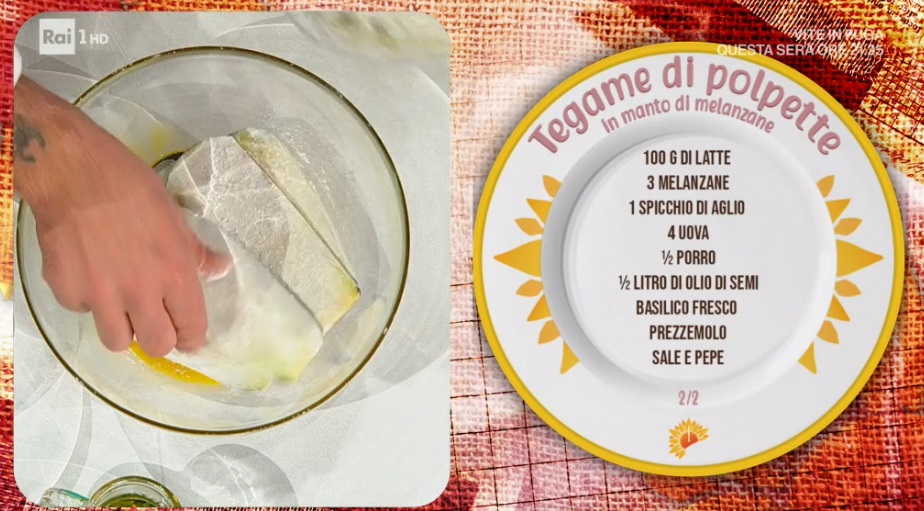 tegame di polpetteMauro e Mattia Improta, padre e figlio, portano in studio il sole di Napoli ed un carico di prelibatezze, tutte rigorosamente made in Campania. I due cuochi preparano il tegame di polpette in manto di melanzane.