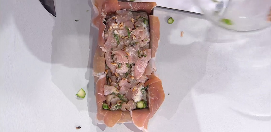 Foderiamo uno stampo da plumcake con il prosciutto crudo affettato, facendo cadere i lembi esterni fuori dallo stampo. Versiamo all’interno l’impasto di pollo e asparagi e ripieghiamo il prosciutto crudo sull’impasto. Mettiamo per mezz’ora in frigorifero, quindi cuociamo in forno caldo a 165° per 50 minuti.