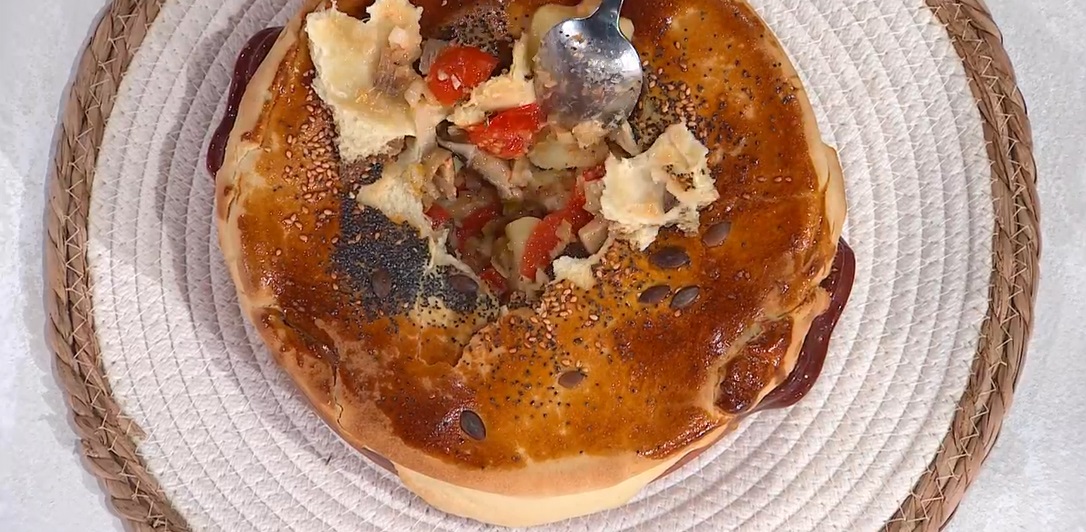 In padella o in una wok, scaldiamo un filo d’olio e mettiamo a rosolare il cipollotto affettato, il sedano tritato, uno spicchio d’aglio ed i pomodorini a spicchi. Dopo qualche minuto, uniamo il baccalà ammollato e tagliato a bocconcini. Lasciamo cuocere giusto 5 minuti, quindi lo preleviamo con una pinza e lo mettiamo da parte. Continuiamo a cuocere il fondo, aggiungendo anche i funghi cardoncelli a pezzetti e le patate a dadoni, precedentemente sbollentate. Dopo qualche istante, uniamo nuovamente il baccalà e trasferiamo il tutto in una pirofila o un coccio. Sigilliamo quest’ultimo con il disco di pasta preparato in precedenza, facendo aderire bene ai bordi. Spennelliamo con il tuorlo sbattuto e spolveriamo con i semi. Cuociamo in forno caldo e ventilato a 180° per 20 minuti.