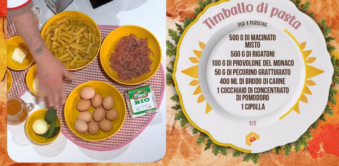 - 500 g macinato misto, 500 g rigatoni, 100 g provolone, 50 g pecorino grattugiato, 400 ml brodo di carne, 1 cucchiaio di concentrato di pomodoro, 1 cipolla, 1 foglia di alloro, 1 bicchiere di vino bianco, 50 g burro, 10 uova, pane raffermo, 250 g scamorza affumicata, olio evo, sale e pepe
