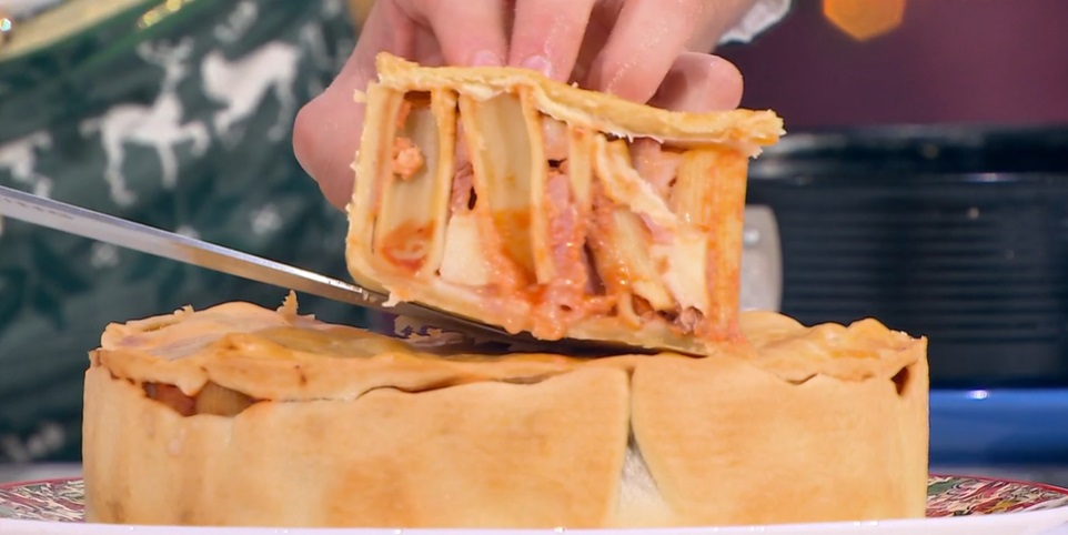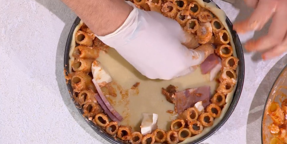 All’interno del guscio di brisè ancora crudo, disponiamo i rigatoni, in piedi. Tra un cerchio e l’altro di rigatoni, intervalliamo delle losanghe di mozzarella e prosciutto cotto. Spolveriamo la pasta con altro formaggio grattugiato, quindi copriamo con il secondo disco di brisè, sigillando bene i bordi. Pratichiamo qualche foro in superficie e spennelliamo con l’uovo sbattuto con poco latte. Cuociamo in forno caldo e statico a 180° per 40 minuti. Serviamo a fette con il ragù avanzato.