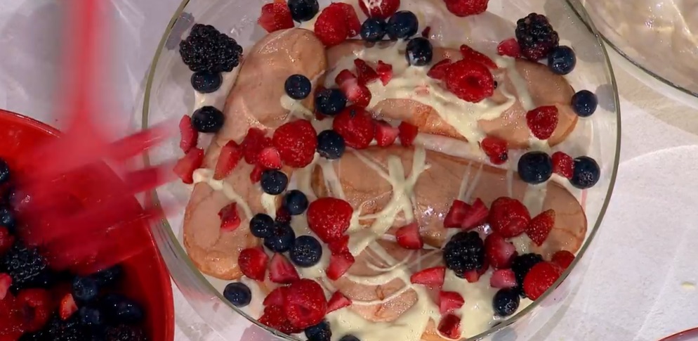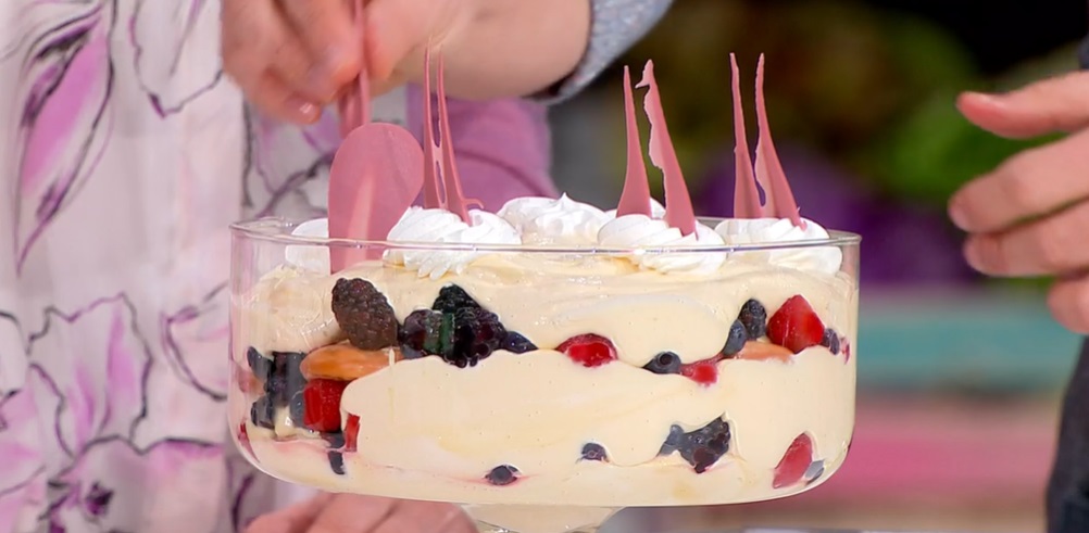 All’interno di una coppa o una pirofila, formiamo un primo strato di crema al mascarpone. Adagiamo sopra i savoiardi inzuppati nello sciroppo ai frutti di bosco, qualche frutto marinato e un po’ di cioccolato bianco fuso. Ripetiamo gli strati: savoiardi inzuppati, crema, frutti di bosco e cioccolato bianco. Finiamo con abbondante crema, ciuffi di panna montata, decori di cioccolato rosa (ruby) e frutta fresca.