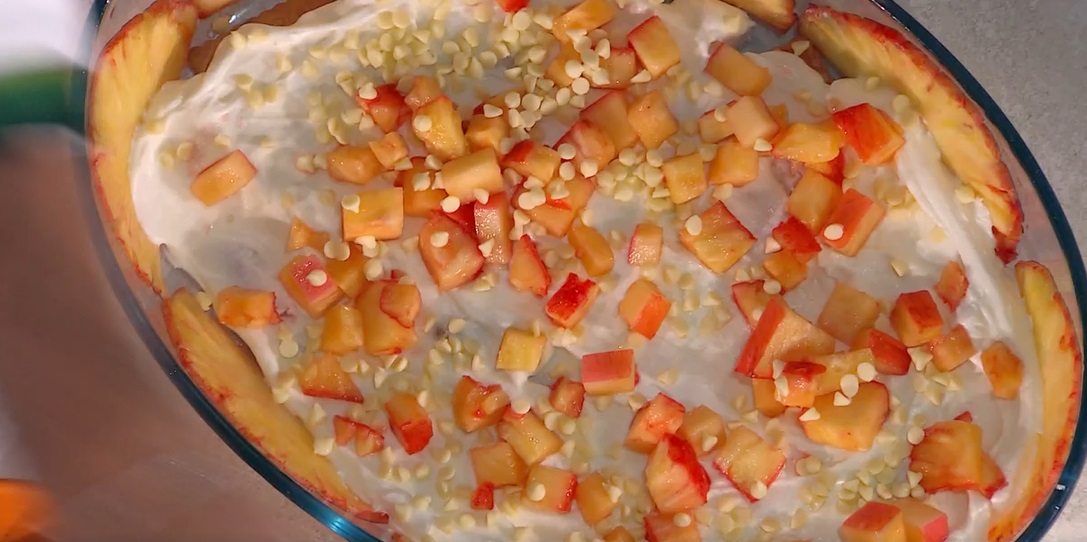 Inzuppiamo i biscotti nel succo rimasto dalla marinatura dell’ananas. Alla base della tortiera foderata ai lati con le fettine di ananas, formiamo uno strato di biscotti inzuppati, sopra creiamo un abbondante strato di crema e proseguiamo con cubetti di ananas, scaglie di cioccolato bianco e ricominciamo con uno strato di biscotti inzuppati, altra crema, cubetti di ananas e scaglie di cioccolato bianco. Finiamo con uno strato di crema, che lisciamo. Mettiamo in frigorifero qualche ora. Decoriamo con ciuffi di panna e decoriamo con dei lamponi.