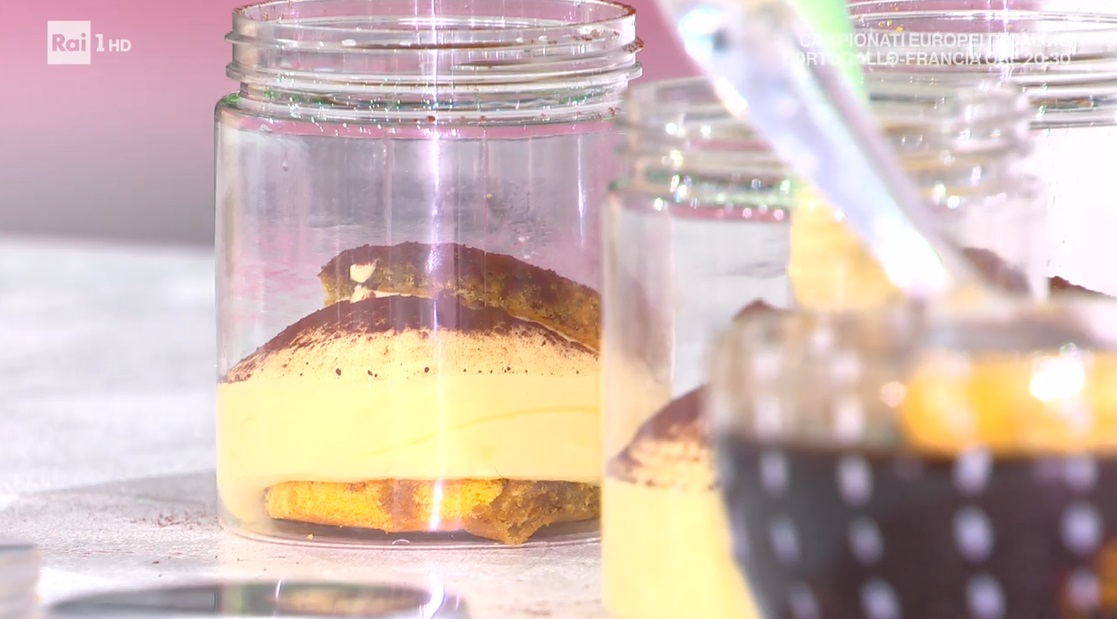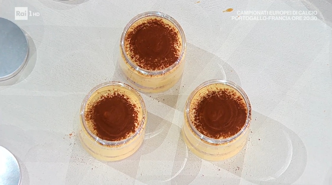 All’interno del vasetto, mettiamo un disco di pan di Spagna o un savoiardo inzuppato con la bagna. Coliamo sopra la crema al mascarpone, adagiamo sopra un altro disco di pan di Spagna inzuppato, una spolverata di cacao ed ancora crema al mascarpone. Finiamo con il cacao amaro in polvere e conserviamo in frigorifero fino al momento di servire.