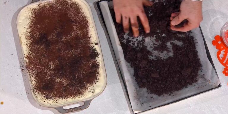 Prima di servire, spolveriamo la superficie del tiramisù con del cacao e, infine, con il crumble.
