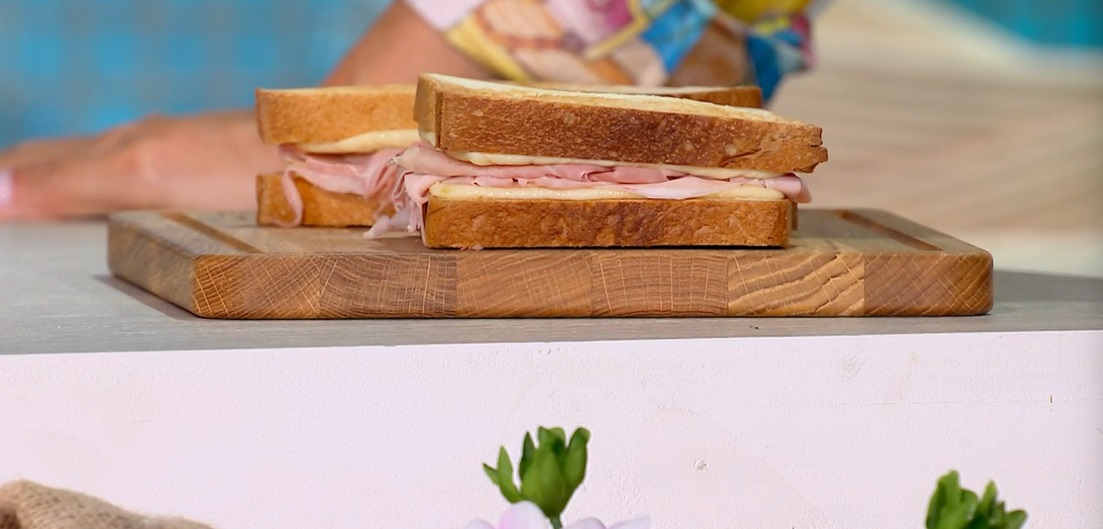 In questo caso, Fulvio usa del prosciutto cotto, formaggio a fette e salsa con senape, burro e miele.