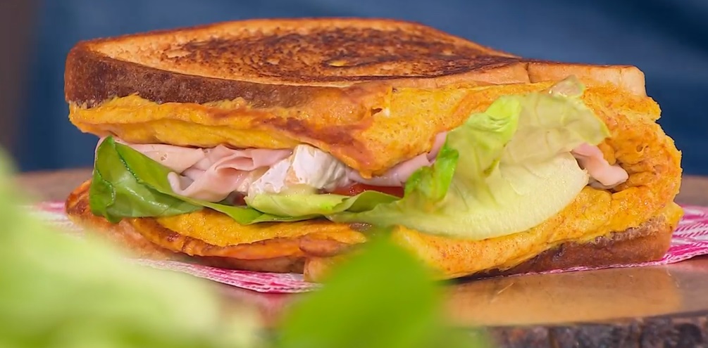 In padella, facciamo scaldare abbondante burro. Spennelliamo le fette di pane con il burro fuso, su un lato. Quando la padella con il burro è ben calda, versiamo le uova sbattute e posizioniamo sopra le fette di pane (con la parte imburrata verso l’alto). Quando le uova si sono rapprese, giriamo la nostra frittata e ripieghiamo le estremità (quelle senza pane) verso il centro. Distribuiamo su una metà il camembert (o altro formaggio), il prosciutto cotto, pomodoro sottile e lattuga. A questo punto, pieghiamo una fetta di pane sulla farcitura, ricomponendo il toast.