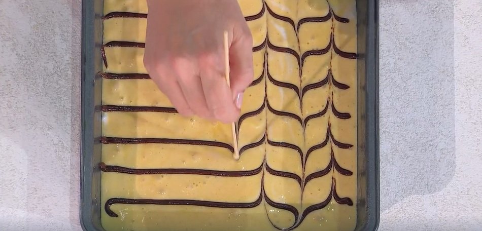 Versiamo l’impasto chiaro all’interno di una teglia quadrata (20 x 20 cm) ben imburrata ed infarinata. Livelliamo e disegniamo sopra, con l’impasto scuro, delle linee. Con uno stuzzicadenti, creiamo i decori (foto). Cuociamo in forno caldo e statico a 170° per 30 minuti.