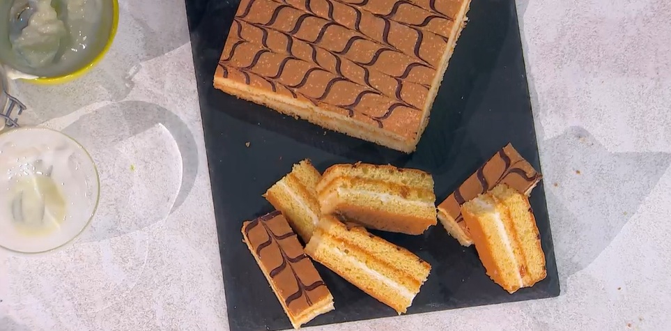 Lasciamo raffreddare la torta, quindi la tagliamo in tre strati. Su uno strato spalmiamo la confettura di albicocche, quindi sovrapponiamo un secondo strato, spalmiamo sopra la crema al formaggio e copriamo con l’ultimo strato di pan di Spagna.