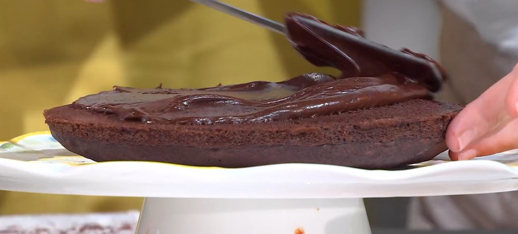 Uniamo le due torte con uno strato di glassa. Spalmiamo sull’intera torta la glassa rimasta.