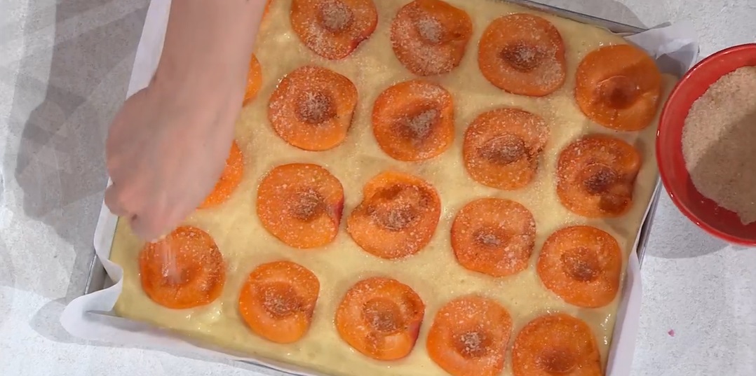 Versiamo l’impasto all’interno di una teglia rettangolare o quadrata foderata con carta forno, in modo da ottenere uno strato spesso 2-3 cm (non troppo alto, quindi). Disponiamo sopra le albicocche tagliate a metà (foto). Spolveriamo la superficie con lo zucchero di canna e cuociamo in forno caldo e statico 170° per 45 minuti.