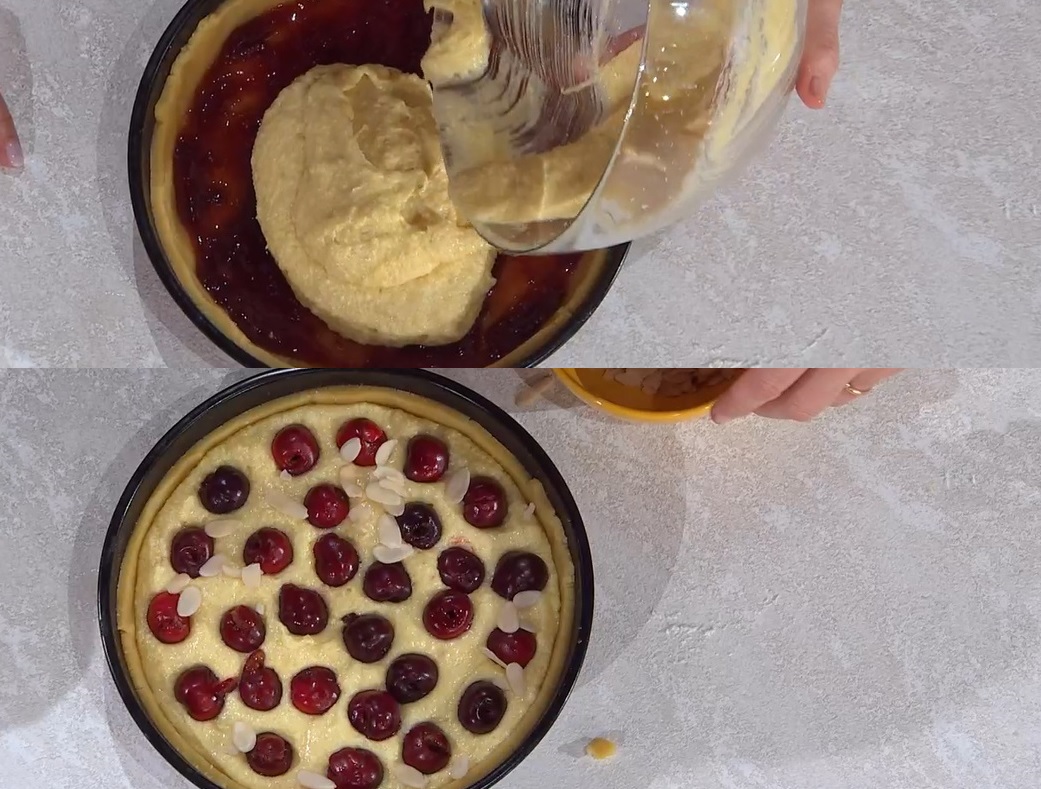 Spalmiamo sul fondo di frolla ancora cruda la confettura di ciliegie. Distribuiamo sopra il ripieno alle mandorle e lo livelliamo. Disponiamo sopra le ciliegie fresche denocciolate, a formare una spirale, e finiamo con le mandorle a scaglie (possiamo evitarle). Cuociamo in forno caldo e statico a 180° per 45 minuti.