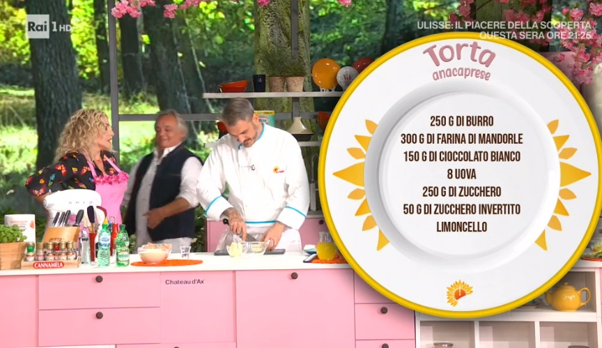 torta anacaprese di Roberto di PintoDirettamente da Napoli, il cuoco Roberto di Pinto ‘piomba’ in cucina, promettendo di preparare un dolce tipico della Costiera, non la celebre torta caprese, ma la torta anacaprese.