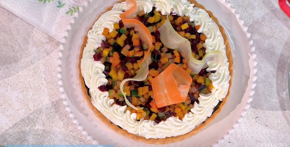 Decoriamo la torta, raffreddata, con i coriandoli di verdure e dei ciuffi di mousse di formaggi. Infine sedano e carote tagliati a stelle filanti.
