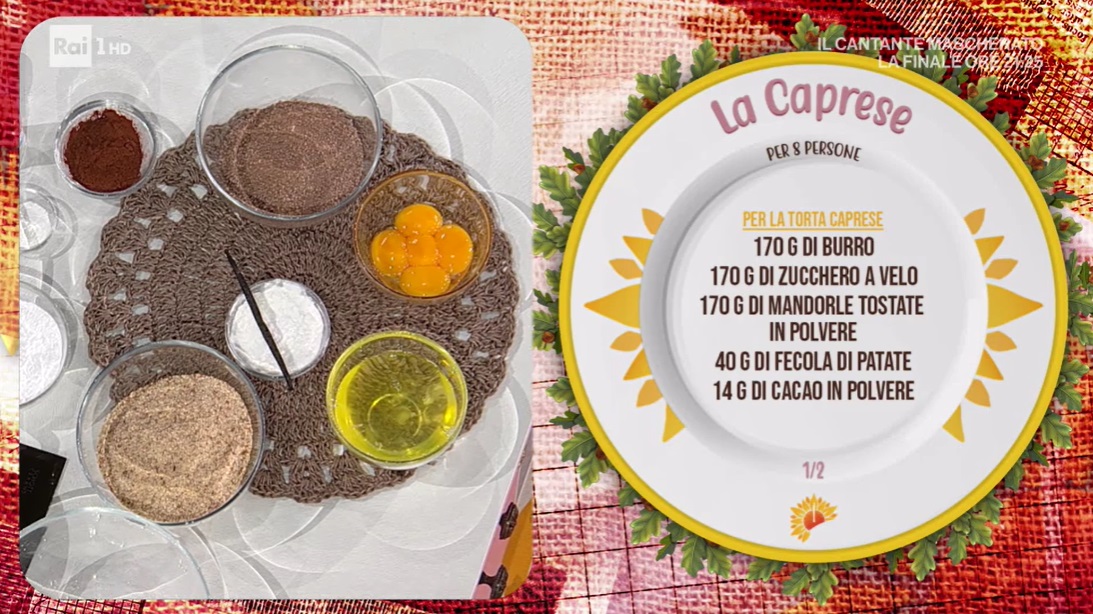 - 170 g burro, 170 g zucchero a velo, 170 g mandorle tostate in polvere, 40 g fecola di patate, 14 g cacao in polvere, 170 g cioccolato fondente al 50%, 85 g tuorli d’uovo, 150 g albumi, 4 g lievito in polvere, mezza bacca di vaniglia, 2 g sale