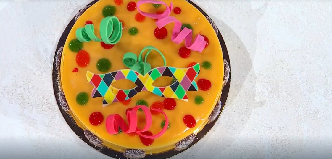 - Glassa: 240 g zucchero, 165 g destrosio, 103 g zucchero invertito, 250 g purea di mango, 103 g glucosio, 20 g gelatina, 80 ml acqua, 100 g burro di cacao, 250 g gelatina neutra