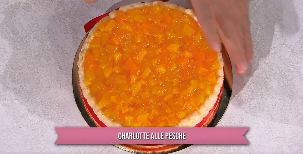 - Crema: 250 g crema pasticcera, 200 ml latte, vaniglia, 300 g pesche frullate, 100 g pesche sciroppate, 10 g gelatina, 50 ml acqua, 350 g panna montata, 35 g zucchero