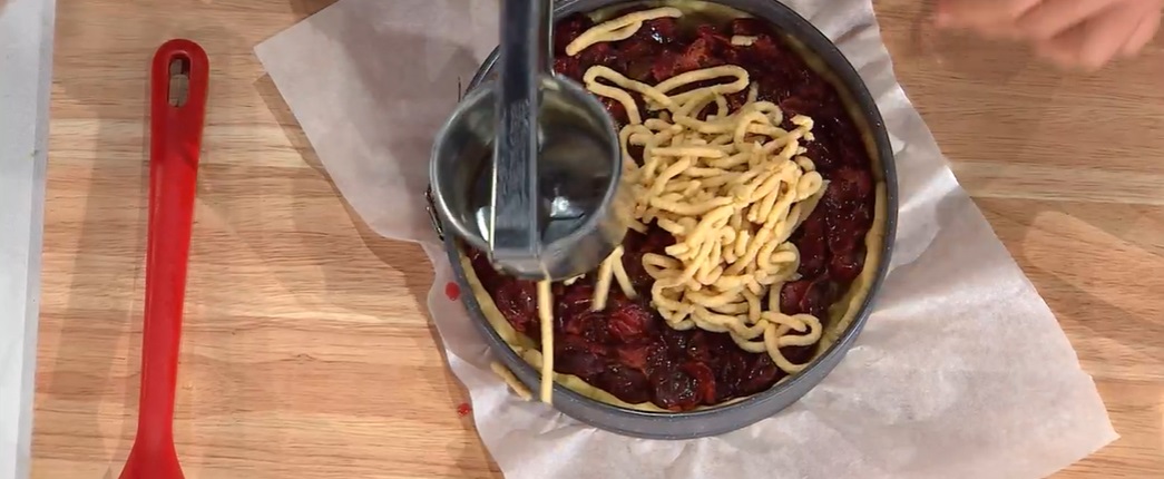 Con le mani, stendiamo metà della frolla direttamente all’interno di una tortiera foderata alla base con carta forno, in modo da coprirne il fondo e formare un bordino di 1 cm circa. Distribuiamo sopra le prugne ben sgocciolate. A parte, lavoriamo la frolla rimasta con il sughino delle prugne, in modo da ammorbidirla. Inseriamo la frolla ammorbidita in uno schiacciapatate e la ‘schiacciamo’ sul ripieno di prugne, in modo da coprirle. Cuociamo in forno caldo e statico a 170° per 50 minuti.