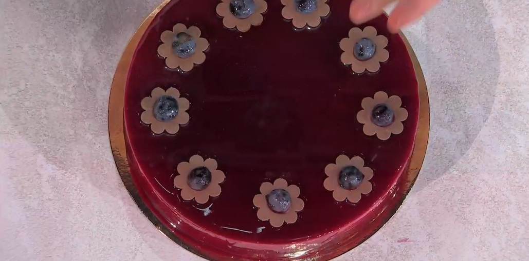 Sformiamo la torta e coliamo sopra la glassa all’uva e mirtilli. Decoriamo a piacere.