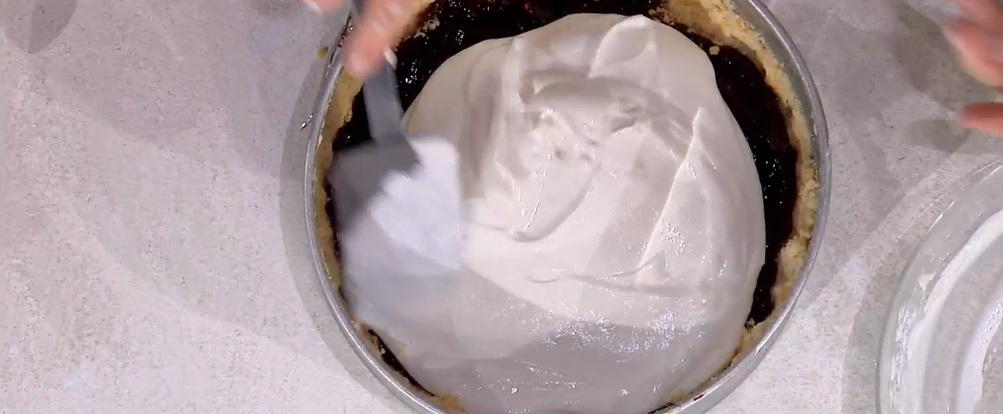 Per la crema, mescoliamo lo yogurt greco con l’amido di mais (meglio se setacciato). Con le fruste, montiamo a neve gli albumi con lo zucchero e li incorporiamo allo yogurt, mescolando delicatamente.