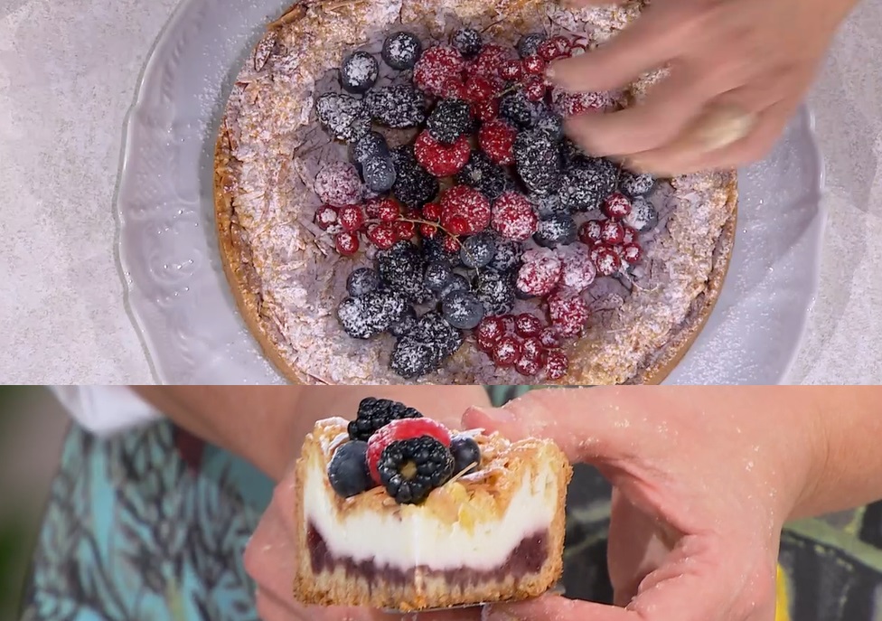 - Ripieno: 350 g yogurt greco, 30 g amido di mais, 80 g zucchero, 2 albumi, 300 g confettura ai frutti di bosco, 20 g mandorle