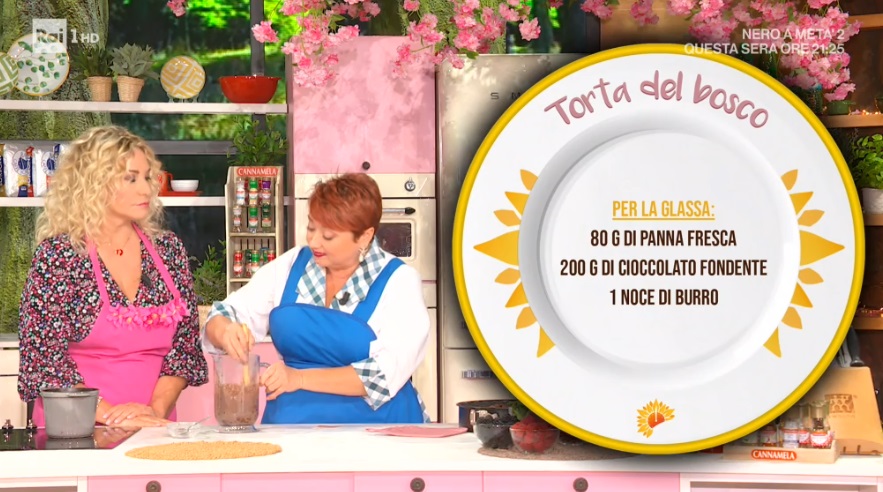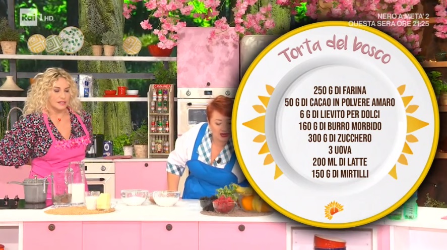 torta del boscoInizio emozionato ed emozionante. Antonella torna nelle nostre case e lo fa da uno studio colorato ed accogliente, insieme ad un cast inedito, di nonne e cuoche veraci. La prima è ‘la zia Cri‘, cuoca romagnola. E’ lei ad aprire il menu odierno con un ‘consiglio’ per la merenda. Vediamo come preparare la torta del bosco.