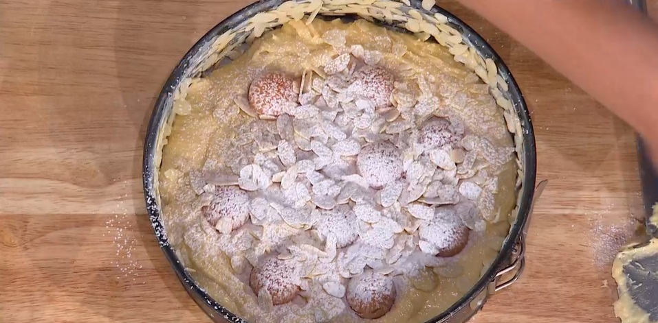 Riempiamo degli stampini rotondi o quelli per i cubetti del ghiaccio con la confettura di albicocche e mettiamo nel freezer. Imburriamo molto bene una tortiera, mettiamo alla base e sui lati le mandorle a lamelle, sopra versiamo tutto l’impasto. Livelliamo, disponiamo sopra le palline di confettura congelati. Spolveriamo con altre mandorle e zucchero a velo e inforniamo a 180⁰ per 35/40 minuti.