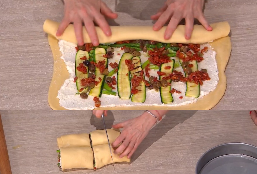 Stendiamo l’impasto con il mattarello, creando un rettangolo sottile. Spalmiamo sopra la crema di ricotta e burro e distribuiamo sopra il formaggio grattugiato, gli sparagi già cotti a listarelle, le zucchine grigliate, i pomodori secchi sott’olio a pezzetti, le olive denocciolate. Arrotoliamo l’impasto sul ripieno, partendo dal lato lungo. Tagliamo a fette spesse 3-4 cm, quindi disponiamo le girelle ottenute all’interno di una tortiera, lievemente distanziate. Copriamo e lasciamo lievitare fino al raddoppio (circa 2 ore).