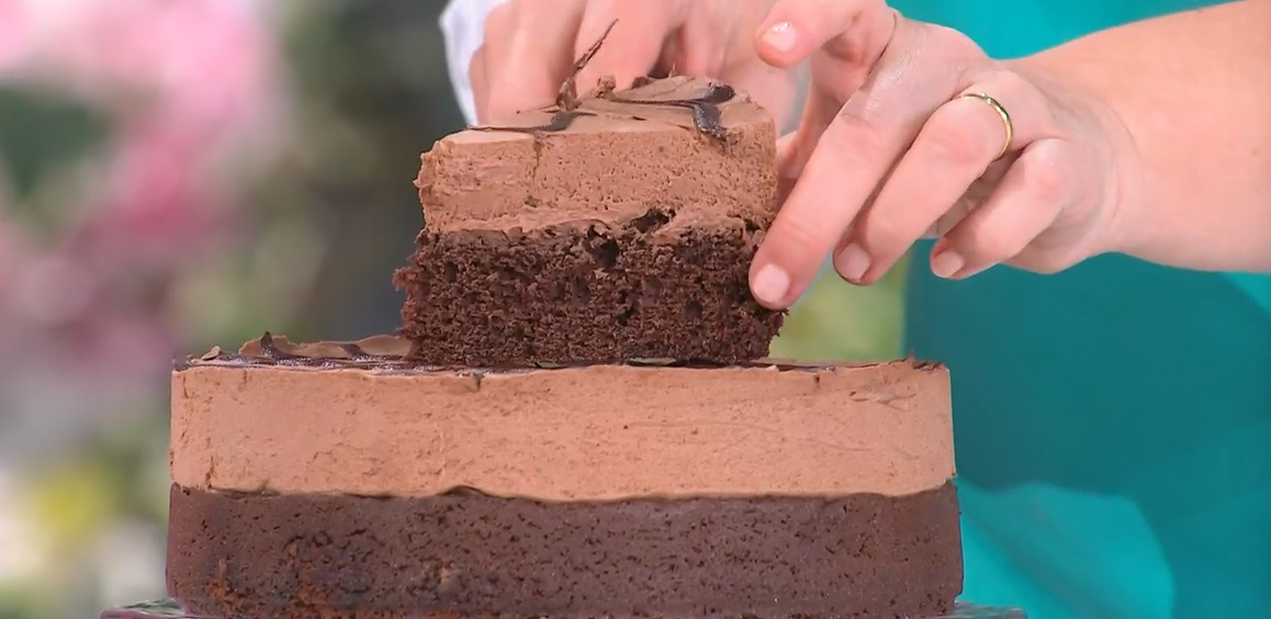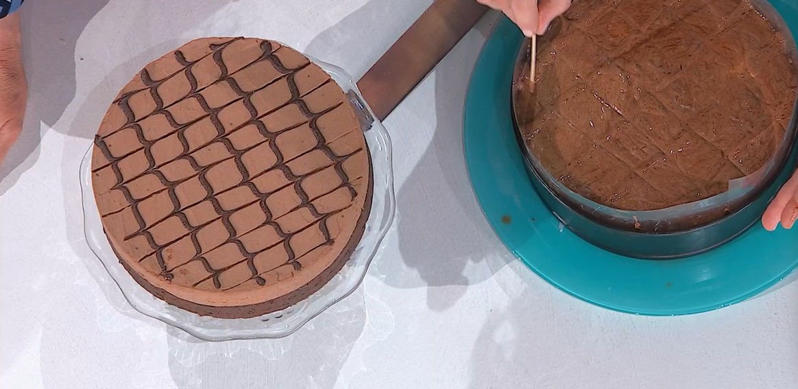 Per decorare, mettiamo del cioccolato fondente fuso in un conetto di carta e disegniamo sulla copertura della torta delle righe. Passiamo con lo stuzzicadenti, da un lato all’altro della torta, disegnando il decoro in foto. Lasciamo raffreddare in frigorifero per 2-3 ore. Possiamo anche congelarla.