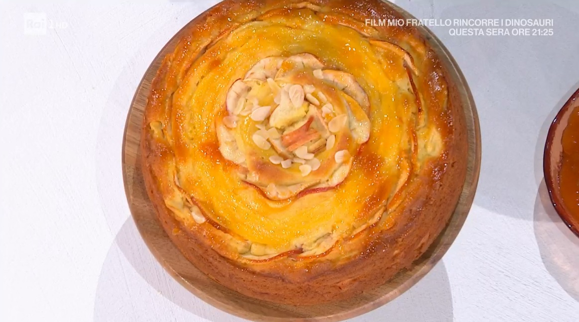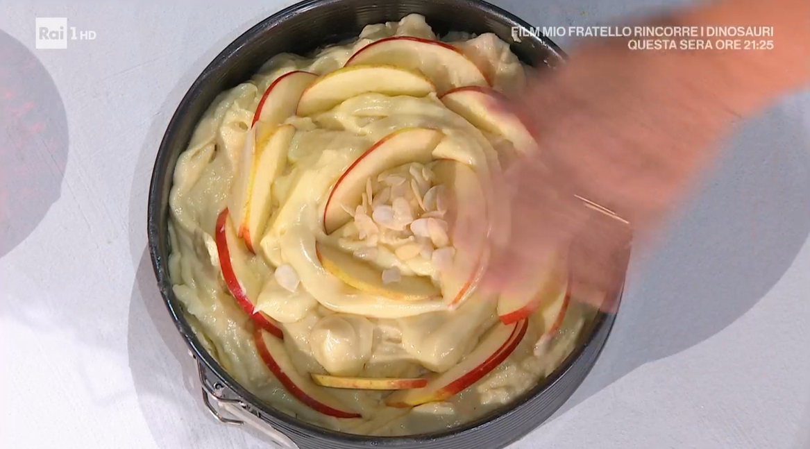 Imburriamo ed infariniamo una tortiera (oppure usiamo lo staccante di Natalia, qui la ricetta) e versiamo all’interno metà dell’impasto. Lo livelliamo alla base e distribuiamo sopra metà della crema ormai fredda a ciuffi. Copriamo con l’impasto rimasto e lo livelliamo. Decoriamo in superficie con la mela tagliata a fettine (con la buccia) e la crema rimasta: disegniamo una spirale. Finiamo con le mandorle a lamelle e cuociamo in forno caldo e statico a 180° per 45 minuti. Uscita dal forno, la spennelliamo con la confettura.