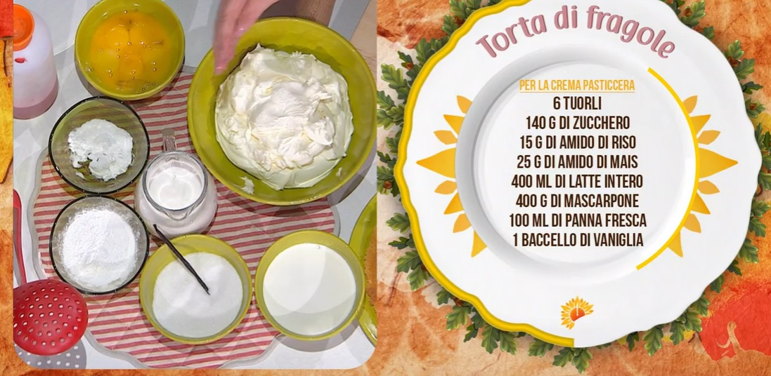 - Crema: 6 tuorli, 140 g zucchero, 15 g amido di riso, 25 amido di mais, 400 ml latte, 400 g mascarpone, 100 ml panna fresca, vaniglia