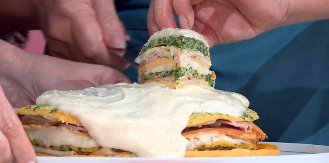 torta di frittate di Zia CriNon solo Persegani, tocca anche alla mitica Zia Cri rappresentare l’Emilia Romagna, la terra dalle mille specialità gastronomiche. La zia prepara un piatto del recupero, ricco e scenografico. Ecco la torta di frittate.