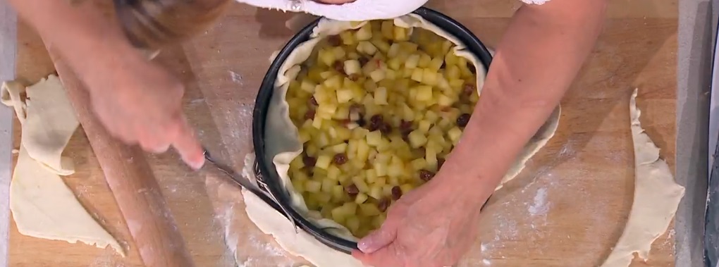 Spalmiamo sul fondo la confettura di albicocche, spargiamo sopra abbondante pangrattato e distribuiamo sopra il ripieno di mele. Stendiamo l’impasto rimasto ed usiamo il disco ottenuto per chiudere la torta. Sigilliamo bene i bordi e creiamo un foro al centro. Spolveriamo la superficie con zucchero semolato e cuociamo in forno caldo e statico a 180° per 40 minuti.