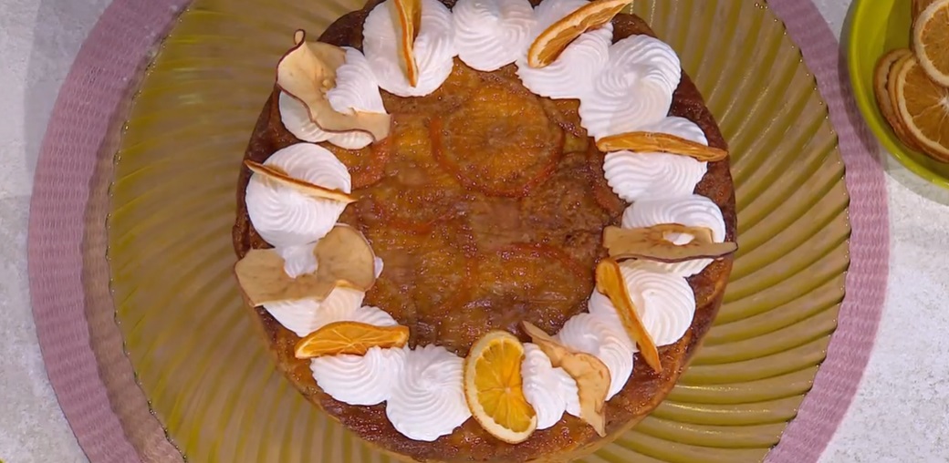 Una volta cotta e intiepidita, la rovesciamo e la decoriamo con ciuffi di panna montata e chips di mele e mandarini essiccati in fondo a 90⁰ per circa 1 ora.