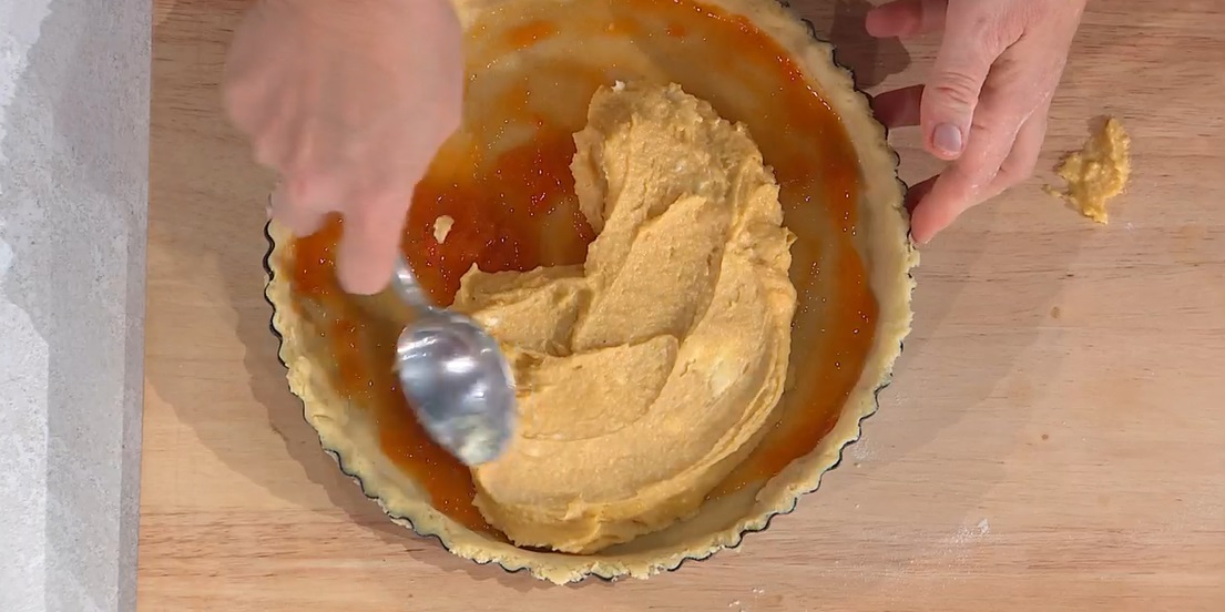 Imburriamo (o usiamo lo staccante, qui la ricetta) una teglia per crostate e foderiamo il fondo con un disco di carta forno. Stendiamo la frolla ad uno spessore di circa mezzo cm e la inseriamo all’interno della teglia per crostate. Spalmiamo sulla base di frolla ancora cruda metà della confettura di albicocche. Spalmiamo sopra la crema frangipane, quindi disponiamo sopra le mele a dadini, precedentemente irrorate con il succo di limone (per non annerire). La cuociamo in forno caldo e statico, nella parte bassa del forno, a 180° per 50 minuti. Una volta tiepida, la spennelliamo con la confettura rimasta.