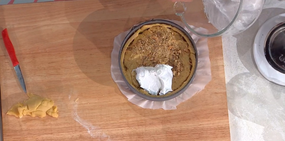 Stendiamo la pasta frolla ad uno spessore di 3-4 mm e la usiamo per foderare una tortiera imburrata ed infarinata. Versiamo all’interno il ripieno alle noci e lo livelliamo. Spargiamo sopra le noci tritate grossolanamente e copriamo con la meringa, che disponiamo sopra a cucchiaiate. Cuociamo in forno caldo e statico a 170° per 45 minuti.