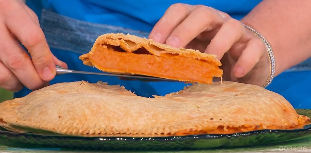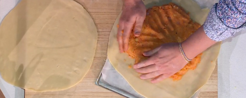 Dividiamo l’impasto riposato in due parti uguali. Stendiamo la prima metà, sottile, come fosse pasta all’uovo. Posizioniamo la sfoglia ottenuta su una teglia con carta forno, quindi stendiamo anche l’altra metà, allo stesso modo. Distribuiamo il ripieno di patate sulla prima sfoglia, lo compattiamo con le mani e copriamo con la seconda sfoglia, sigillando bene i bordi con la forchetta (foto).