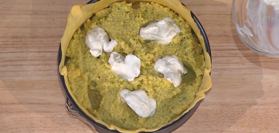 Stendiamo la brisè con il mattarello e la usiamo per foderare una tortiera imburrata da 26-28 cm di diametro. Versiamo sul fondo il ripieno di patate ‘semplice’; livelliamo e distribuiamo sopra il ripieno verde, al pistacchio. Con un cucchiaio, creiamo degli incavi nel ripieno, che riempiamo con la robiola.